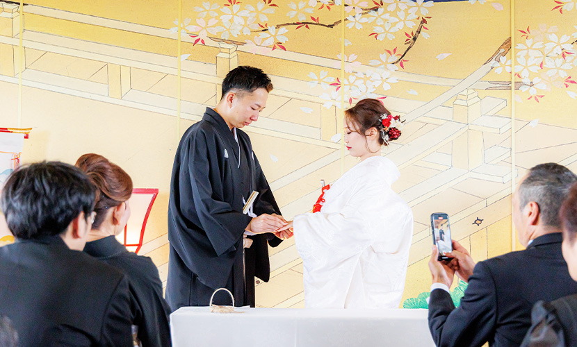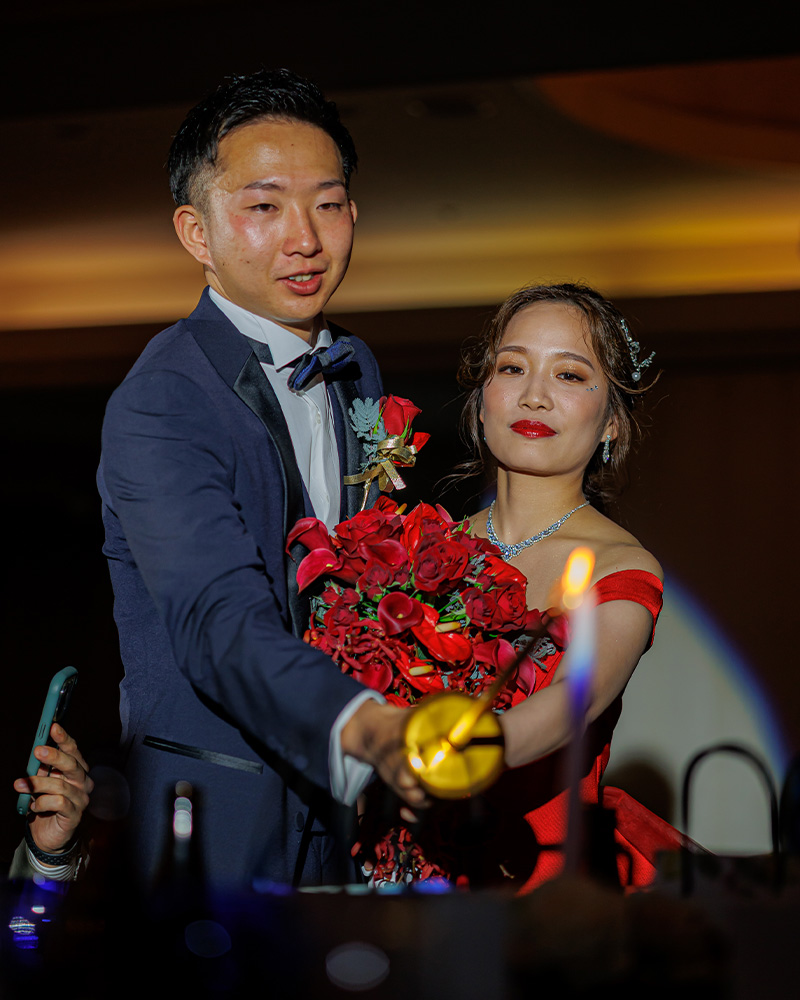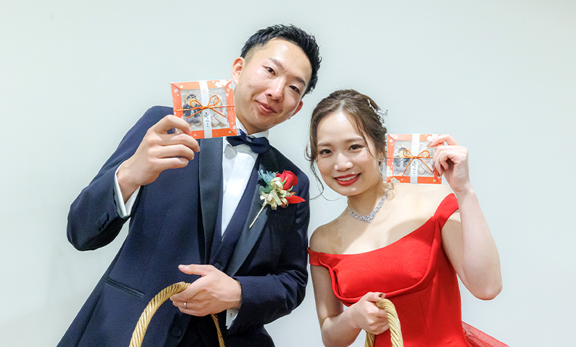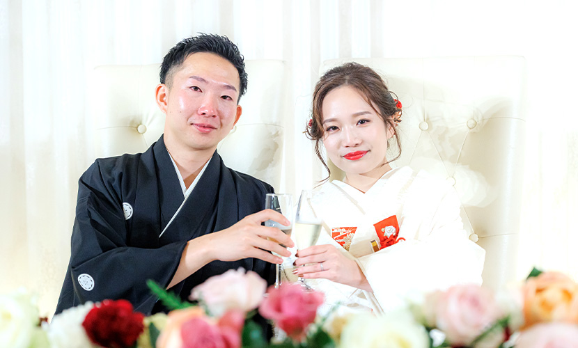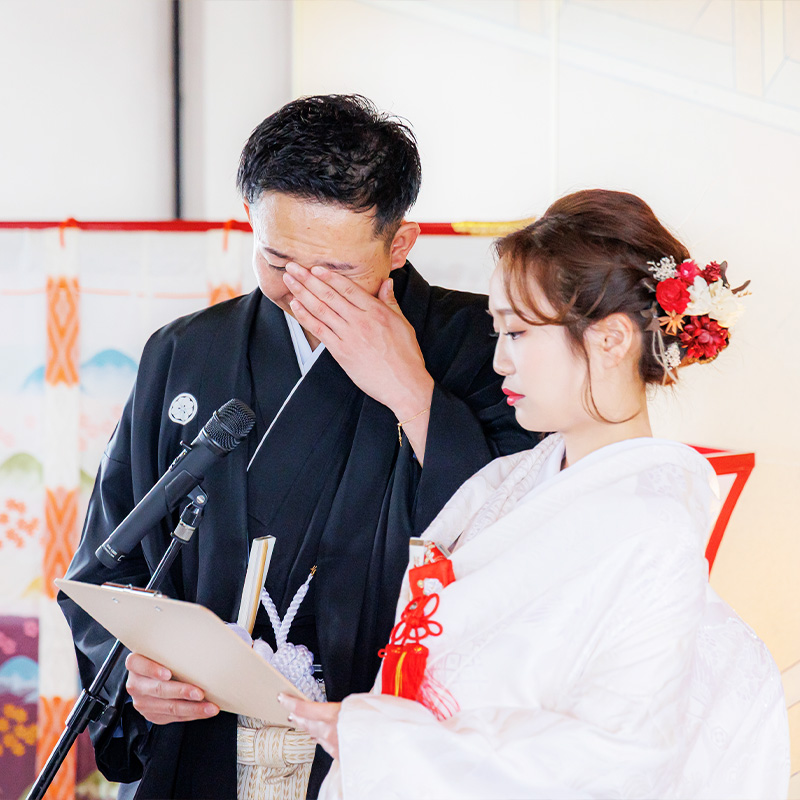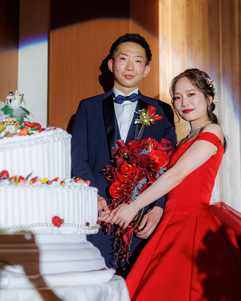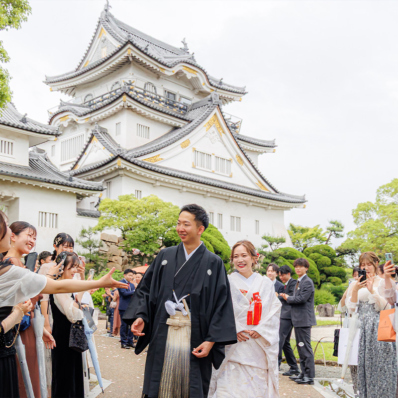 岸和田城挙式 純之介様 夢奈様 2025.06.14 たくさんの笑顔と涙に包まれたWedding CEREMONY 新婦様たってのご希望の演出 紅差しの儀 挙式前から涙があふれていました。 「いままで育ててくれてありがとう」 「いってらっしゃい、幸せにね」 そんな想いが込められています。 岸和田城での人前結婚式 大切な皆様の前で結婚を誓い お二人らしさあふれる挙式となりました。 誓いの言葉、代表立会人署名、指輪交換、リングキッズなど たくさんの演出が盛り込まれていました。 天守閣からのお手振りやフラワーシャワーも行われました。天候にも恵まれ、素敵な挙式となりました。 PARTY 挙式がめでたく結びとなり、続いてご披露宴へ 和装でのご入場 友人様からの楽しい乾杯のご発声により 祝宴がスタートしました 鹿児島県のお祝いの踊りや 大好きな祖母様・お姉様とのご中座 お二人だけのサプライズなど たくさんの演出に笑顔があふれました ♡ 再入場では和装から洋装にお衣裳チェンジ! 新郎様の好きな真っ赤なドレスに身を包んだ新婦様は さらに可愛らしさが増しました キャンドルサービスでゲストのテーブルを回ったり ドレスの色当てクイズ ケーキ入刀 友人様からの漫才 お写真撮影の時間など ゲストの皆様との大切な時間も設けられました そして結びには たくさんの愛情で育て どんなときも見守ってくださった親御様へ 花束と体重ベアのプレゼント ずっと言えなかった“ありがとう” 新郎様のお言葉に 会場の皆様の目には涙がこぼれました ご両家の皆様にとって大切な日に お手伝いをさせていただきましたこと 岸和田グランドホールを選んでいただきましたこと 大変うれしく思います お二人とお打合せをした14カ月は とても楽しい時間でした 純之介様 夢奈様 末永くお幸せに ♡